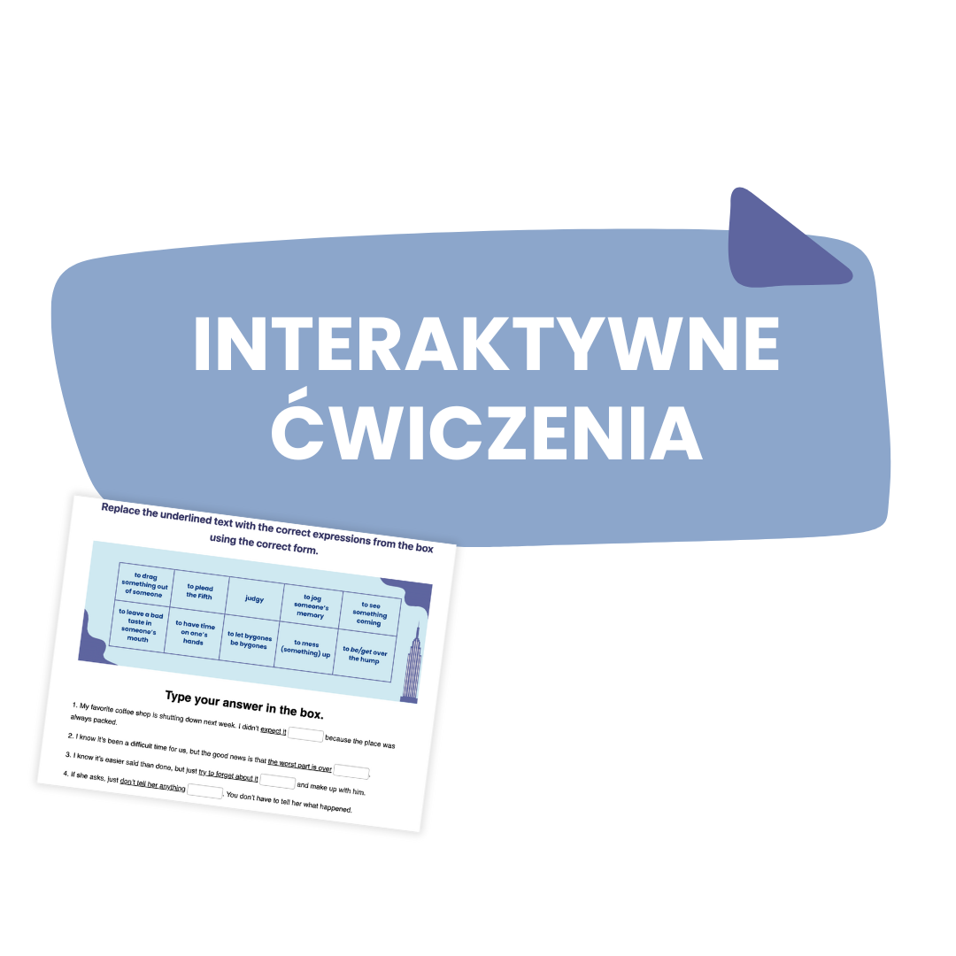 Dzięki interaktywnym ćwiczeniom od razu wykorzystujesz nowe zwroty w praktycznych zdaniach i sytuacjach z życia.