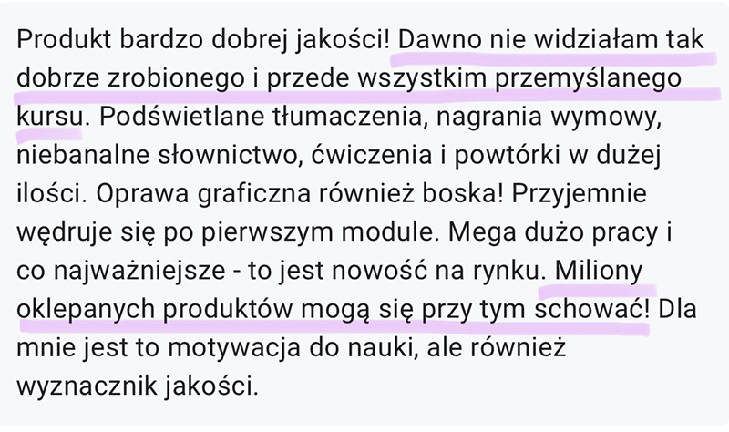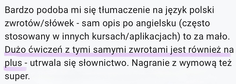 Kurs został zaprojektowany tak, aby oferować różnorodne ćwiczenia, które pomogą Ci nie tylko zapamiętać nowe słowa i wyrażenia, ale przede wszystkim nauczyć się z nich korzystać w codziennych rozmowach.
